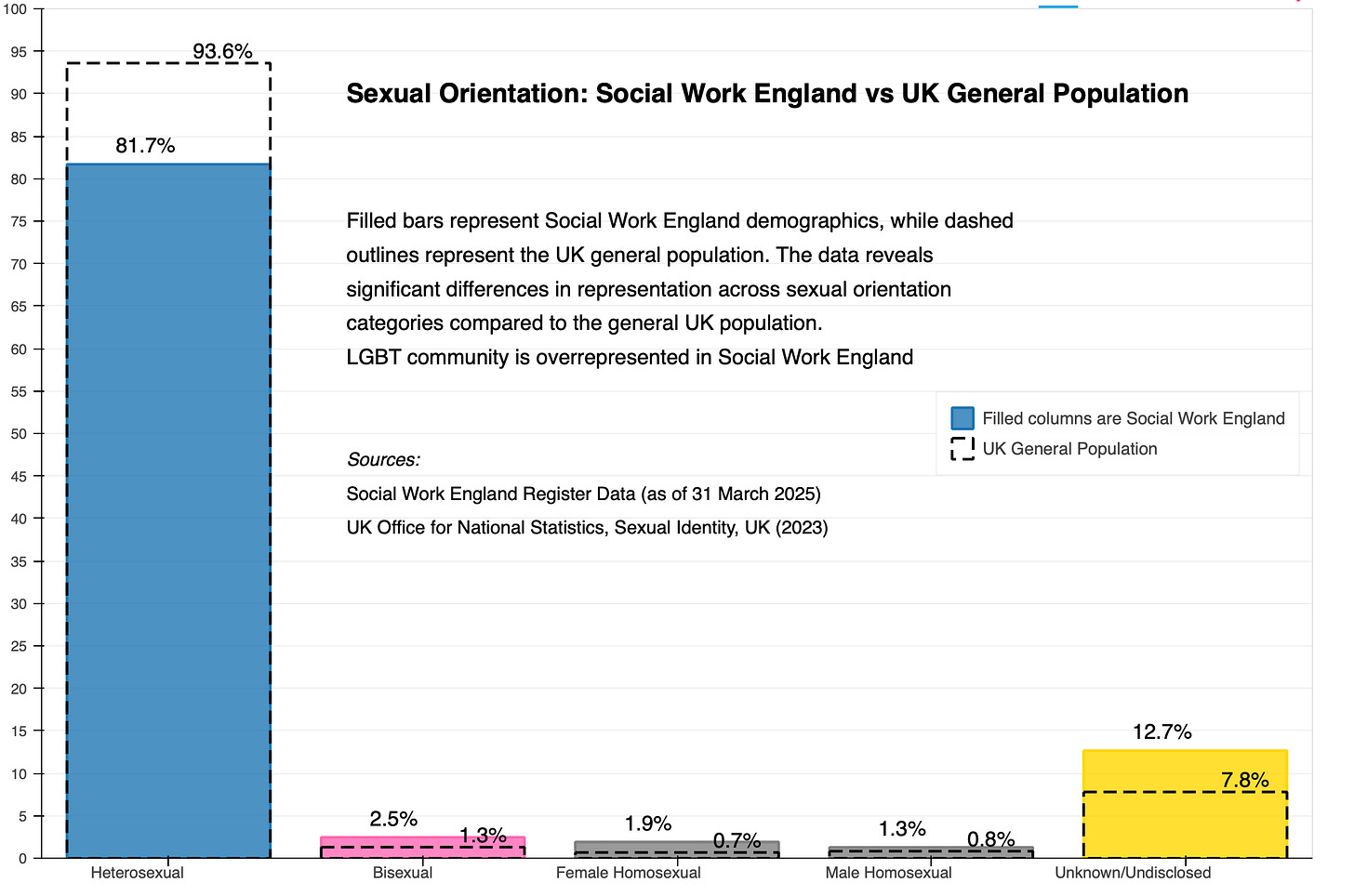 Data Sources: - Social Work England Register Data (as of 31 March 2025) - UK Office for National Statistics, Sexual Identity, UK (2023) - UK Office for National Statistics, Gender Identity (2021 Census, England and Wales)