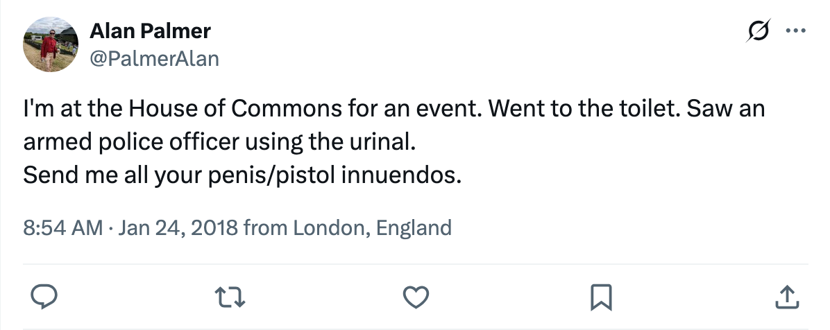 In one post made from within a government building during a House of Commons event, he shared content that appeared to sexualise a male police officer—a behaviour colloquially described as “toilet cruising.”: